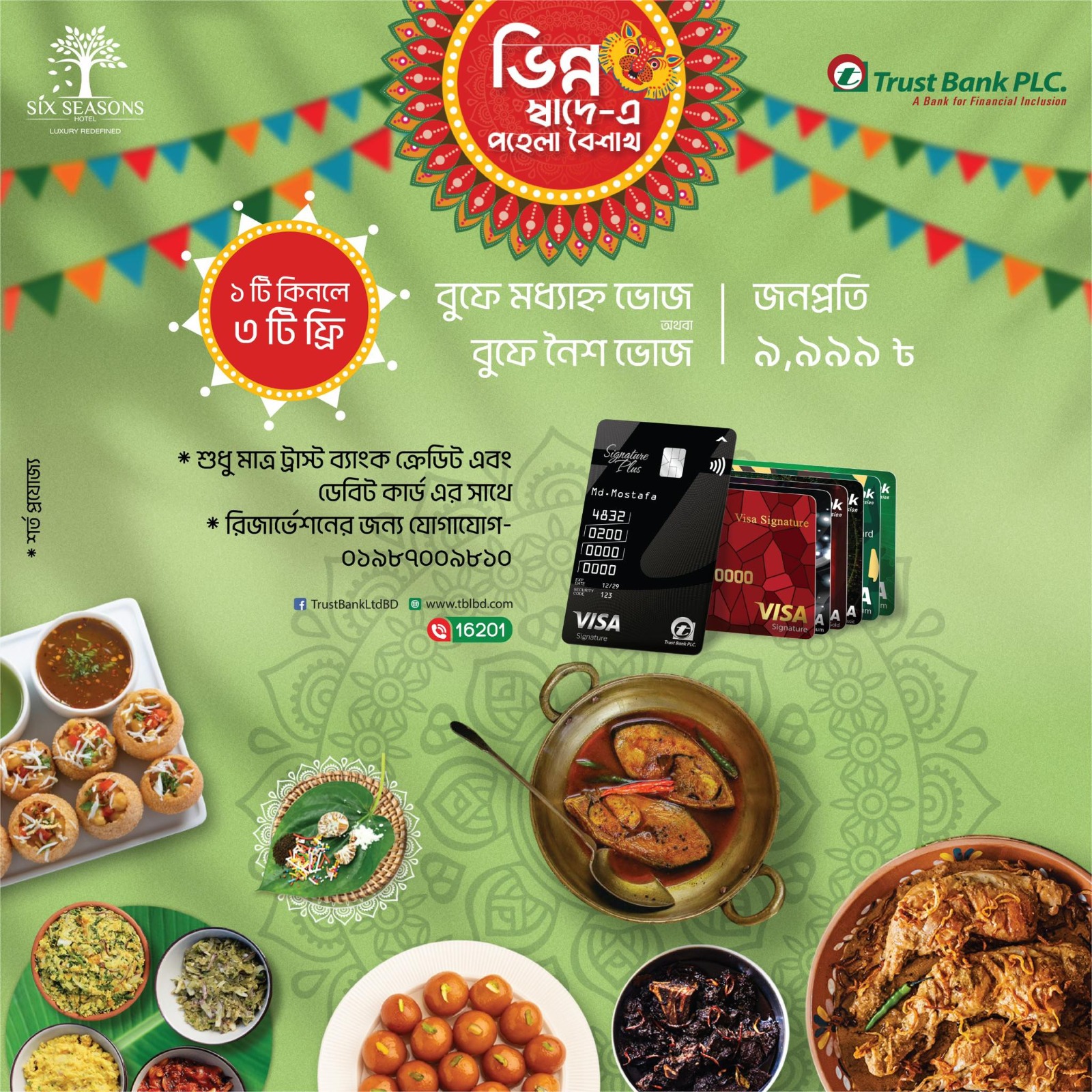 Experience the authentic taste of Boishakh at Six Seasons Hotel. Enjoy our Buy 1 Get 3 Free offer on both lunch and dinner buffets